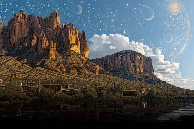 As the sun dips below the horizon, the starlit sky casts a mystical glow over Mesa's iconic cliffs, bringing an otherworldly charm to the Arizona landscape. This remarkable canvas print captures the picturesque beauty of Mesa at twilight, featuring the towering red rock formations that dominate the skyline. Below these ancient rocky giants, the serene reflections in the water add a tranquil symmetry to the scene. Flora typical of the arid Southwest dots the landscape, while the clear night sky is peppered with twinkling stars and ethereal celestial bodies, adding a fantastical element to this natural spectacle.