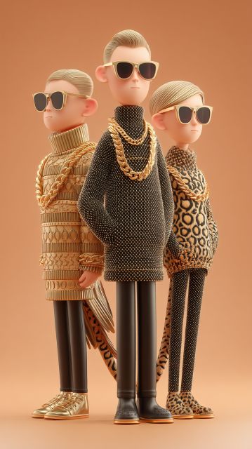 Bathed in a soft peach hue, three stylized figures stand confidently, exuding an aura of modern fashion and cool detachment. Each character is dressed in an intricately detailed ensemble that suggests luxury and high fashion. From the shimmering knit of sweaters to the rich patterns of pants, the textures leap out, bringing their outfits to life. The left-most figure wears a textured golden sweater with matching pants, while the center figure is draped in a bulky scarf and patterned pants. The right-most figure sports a fashionable leopard print top. All three wear dark sunglasses that add an air of mystery and sophistication. Together, they create a vivid tableau that captures the essence of contemporary style and the power of fashion to transform. About Sunglasses: Sunglasses are not just practical eyewear to protect from the sun’s rays; they have been integral to fashion and personal style for decades. Originally developed for pilots in the 1930s, sunglasses became a mainstream accessory thanks to their promotion by film stars and celebrities in the 20th century. Today, they vary widely in shape, color, and design, continuously evolving with fashion trends while also serving as a form of self-expression.
