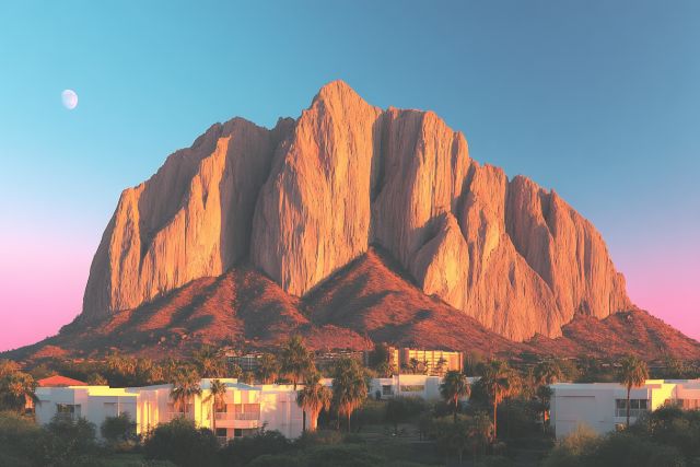 Bathed in the first light of day, the imposing mountain stands as a sentinel over the tranquil urban landscape below. The warm glow of the sunrise infuses the sky with shades of pink and orange, casting a serene light on the modern architectural structures nestled at the mountain's base. Softly, the moon makes a quiet appearance in the clear sky, adding a touch of the celestial to the dawn tableau. This compelling juxtaposition of natural ruggedness with human-made elegance encapsulates the essence of Mesa, Arizona, where nature and civilization intertwine gracefully. The image, perfect for adorning a wall, invites the viewer to contemplate the peaceful coexistence of contrasting elements. *** About Mesa, Arizona: Mesa is the third-largest city in Arizona and offers a rich blend of cultural history, modernity, and natural beauty. It is surrounded by the iconic Superstition Mountains to the east and the Salt River to the north, making it a picturesque site for both residents and visitors. Beyond its natural allure, Mesa is known for its thriving arts scene, diverse culinary options, and numerous outdoor activities that appeal to adventurers and families alike. The city serves as a hub for economic, educational, and cultural activities in the Phoenix Metropolitan area, drawing in a vibrant community committed to innovation and growth.