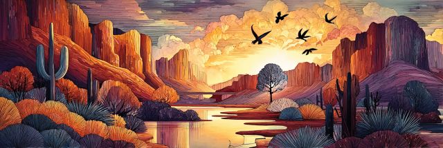 Bathed in the warm glow of a setting sun, the desert landscape of Mesa, Arizona comes alive on this stunning canvas print. The artwork captures the serene beauty of the desert with vivid colors that seem to ignite the sky and silhouetted mountains in the background. A gentle river meanders through the painting, reflecting the fiery orange and pink hues of the sky, while lush vegetation and iconic saguaro cacti punctuate the rugged terrain. In the foreground, a solitary tree stands as a testament to resilience in harsh conditions, adding a poignant touch to the composition. Above, birds glide gracefully, their silhouettes adding a dynamic element to the tranquil scene. This piece not only decorates a space but also evokes the spirit and natural beauty of the American Southwest, making it a perfect centerpiece for both modern and rustic decor styles. ***About Mesa, Arizona***: Nestled in the Sonoran Desert, Mesa is the third-largest city in Arizona, renowned for its stunning landscapes that include deserts, lakes, and mountains. This region is celebrated for its rich biodiversity and unique geological features, offering a picturesque setting that is often captured by artists and photographers. Known for its mild winters and hot summers, Mesa attracts outdoor enthusiasts year-round with activities like hiking, mountain biking, and bird watching. The local flora and fauna, especially the saguaro cactus, are emblematic of the area's natural beauty, making Mesa a compelling subject for artists who wish to convey the essence of the Southwest.