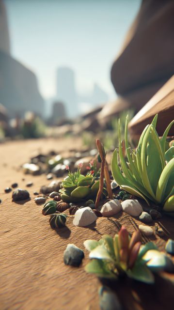 Bathed in the warm golden hour sunlight, a diverse array of succulents thrive amidst a small collection of rocks on a wooden surface, suggesting a scene right out of a serene, urban garden. In the backdrop, the blurred outlines of city high-rises enhance the contrast between nature's delicate forms and the stark, towering structures of human creation. This setting encapsulates a tranquil moment where nature's resilience is witnessed against the backdrop of urban development in Mesa, Arizona. The vivid textures of the succulent leaves, combined with their varied shapes and sizes, create a visual harmony that invites viewers to pause and appreciate the smaller, often overlooked splendors of city life. The composition's focus on such minute details amidst the vastness of the urban environment invokes a sense of quiet solitude and reflection. This artwork poignantly captures the essence of finding beauty and tranquility in unexpected places, making it a compelling decoration for any space that craves a touch of nature's calm.