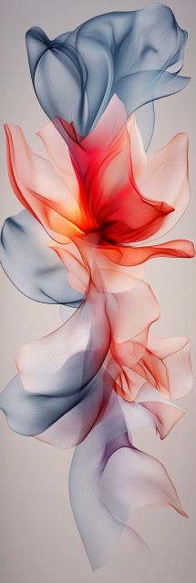As the eyes trace the contours of this transcendent floral piece, one finds oneself immersed in a ballet of colors and shadows. Gentle shades of azure blend seamlessly into vibrant crimson at the heart of the flower, portraying a visual metaphor of warmth meeting cool tranquility. These artfully depicted petals, with their delicate, fabric-like texture, seem to float gracefully against a subtle, soft background. The peculiar luminescence of the artwork suggests the early hours of dawn, when light whispers its first secrets to the day. Each brushstroke visible in the digital rendering adds a layer of depth and emotion, crafting a story of growth, resilience, and beauty.