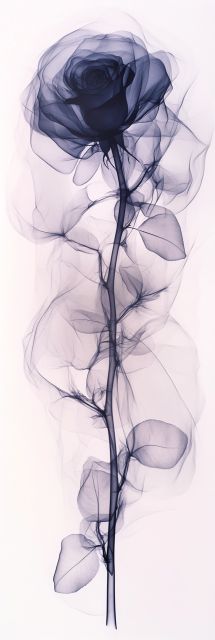 Soft shades of grey and blue cascade through the canvas of "Ethereal Blossom," where an artistic interpretation of a rose captivates the viewer. As though made from whispers of smoke or wisps of mist, the petals of the rose unfurl in a gentle spiral, each line and curve rendered with delicate precision. This image transforms the firm reality of a rose into an evocative, almost otherworldly vision. The elongated stem, accompanied by a few sparse leaves, stretches elegantly, grounding the ethereal flower in a subtle hint of reality. Each petal seems infused with movement, as if a soft breeze could awaken the flower to serene dance. "Ethereal Blossom" transcends traditional floral art by inviting its viewers into a realm of tranquil beauty and introspective calm, making it an ideal piece for contemplative spaces.