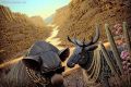 Surreal Canvas Art Depicting a Giant Lizard and Tiny Skeletons