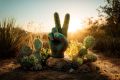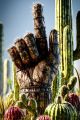 Rustic Wooden Hand Amidst Saguaro Cacti in Arid Mesa Landscape