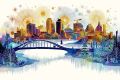 Vibrant Watercolor Depiction of Mesa, Arizona Skyline with Cacti