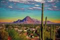 Dramatic Sunset Over Colorful Buildings and Desert Cacti in Mesa, AZ