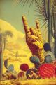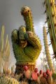 Surreal Desert Scene with Giant Metallic Hand Among Cacti