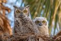 Captivating Gaze of Great Horned Owls Nestled Among Palms