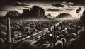 Noir-Inspired Vista: Majestic Saguaro Cactus and Mesa Cityscape