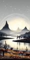 Serene Lakeside View with Monochrome Mountain Landscape and Full Moon