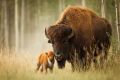Gentle Giants: A Mother Bison with Her Newborn in a Misty Meadow
