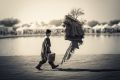 Surreal Encounter: A Timeless Walk Alongside Floating Visions
