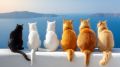 Colorful Lineup of Cats Enjoying a Serene Sea View