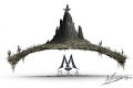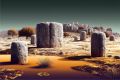 Surreal Desert Mirage: Ancient Stone Pillars Amidst Golden Tones