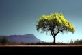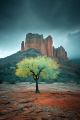 Solitary Yellow Tree Against Majestic Red Cliffs Under Moody Skies