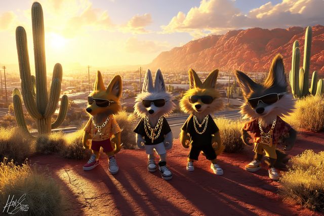 Bathed in the golden glow of a setting sun, a group of stylish cartoon foxes casually strolls along a desert road in Mesa, Arizona. These suave characters exude confidence with their trendy outfits and sunglasses. The scene is set against a breathtaking backdrop of towering cacti and distant red rock mountains, highlighting the unique beauty of the American Southwest. Each fox sports a unique style, from flashy gold chains to sleek sneakers, bringing a hip, animated vibe to the serene desert landscape. The attention to detail in their expressions and clothing merges urban fashion with the natural world, underscoring a fusion of culture and wilderness. This art piece not only showcases a fictional narrative but also emphasizes the majestic yet rugged landscape of Mesa, Arizona. *** About Mesa, Arizona: Mesa, Arizona, is a vibrant city located in the greater Phoenix area, known for its rich history and picturesque scenery. The city is surrounded by the Sonoran Desert, offering stunning natural landscapes including cactus-filled plains and dramatic red rock formations. Mesa's cultural heritage is deep-rooted with Native American influences and also hosts a variety of modern attractions such as museums, shopping centers, and culinary hotspots. It is a favorite among outdoor enthusiasts, with activities ranging from hiking and biking to bird watching and golfing, set often against spectacular backdrops.