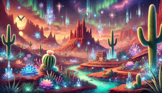 Bathed in the ethereal glow of starlight and luminous flora, the Mesa landscape transforms into a mystical desert realm. This exquisite canvas art invites viewers into a fantastical version of Mesa, Arizona, where the natural rugged beauty of the desert meets an otherworldly spectacle. Cascading waterfalls and serene rivers flow smoothly among vibrant, glowing cacti and shimmering plants, enhancing the magical ambiance. Hovering crystals emit a soft light, casting a spell over the terrain below. In the sky, a dynamic array of colors paints a twilight scene, while floating celestial bodies provide a backdrop of the infinite universe. A lone eagle soars above, embodying the freedom and spirit that this enchanted land suggests. As night descends, the desert reveals its hidden secrets, crafting a narrative of wonder and exploration.*** About Mesa, Arizona: Mesa, Arizona is the third-largest city in Arizona and offers a blend of urban and natural attractions. Known for its rich historical heritage and vibrant cultural scene, Mesa is surrounded by the Sonoran Desert, which presents countless recreational opportunities. The city's proximity to natural landmarks like the Superstition Mountains and the Salt River adds to its allure. Mesa's historical sites, such as the Mesa Grande Cultural Park, display the city's deep-rooted connections to Native American civilizations, making it a significant archaeological site. As a center of innovation and community, Mesa continues to grow and attract visitors and residents alike with its unique charm and diverse landscape.