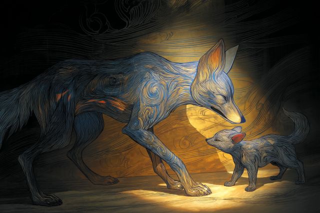 Bathed in a mystical glow, two ethereal canine figures engage in a serene meeting amidst sinuous waves of wood grain. The larger creature, an embodiment of grace and power, leans gently toward the smaller, exuding an aura of wisdom and protection. This artwork captures a fantastical moment frozen in time, highlighted by the intricate play of blue and golden tones that dance across their forms, animating the scene with a lifelike vibrancy. The swirling patterns suggest not just movement but a spiritual connection between the tangible and the unseen, creating a dreamlike state that invites viewers to pause and reflect on the relationships within the natural world. The scene, seemingly unfolding in an otherworldly forest, resonates with themes of kinship, guidance, and the cyclical nature of life. *** About Mythical Creatures ***: The depiction of these canine entities pulls from a rich tapestry of mythology where animals symbolize various human traits and natural phenomena. In many cultures, canines, particularly wolves, are often portrayed as guides or protectors, traversing between physical and spiritual realms. This artwork could represent guardianship or companionship, echoing age-old tales where animals serve as protectors or messengers from the beyond, embodying both the wisdom of nature and the depths of the unknown.