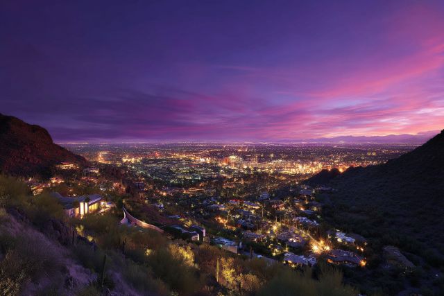 Bathed in the vibrant hues of twilight, the city of Mesa, Arizona unveils itself under a dramatic sky painted with crimson and indigo. From a vantage point atop a nearby hill, the sprawling urban landscape stretches toward the horizon, illuminated by countless sparkling lights. The setting sun casts a soft glow, highlighting the unique topography and dense clusters of buildings that mark the city's bustling environment. The foreground reveals rough, desert textures and sparse vegetation typical of the Arizona landscape, creating a stark contrast to the urban glow below. As night descents, the serene beauty of this juxtaposition invites observers to contemplate the harmonious interplay between nature and human habitation. *** About Mesa, Arizona: Mesa, located in the East Valley section of the Phoenix Metropolitan Area, is the third-largest city in Arizona. Known for its rich historical foundations and cultural diversity, Mesa offers a unique blend of suburban and city life. The city is home to numerous higher educational institutions, cutting-edge healthcare facilities, and robust arts and cultural complexes. Its geography is marked by the Sonoran Desert, providing residents and visitors with spectacular natural scenery and outdoor recreational activities. Mesa's economy is a dynamic mix of aerospace, tourism, education, and health services, contributing to its growth and development.