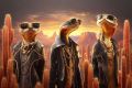 Stylish Cobra Trio Dressed in Suits Against Mesa's Sunset