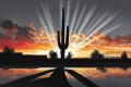 Surreal Metallic Cactus Emerges Against a Golden Horizon