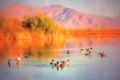 Serene Sunset Over Mesa's Reflective Waters with Graceful Ducks