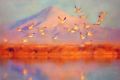 Flight at Dusk: Snow Geese Over Mesa's Reflective Waters