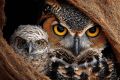 Intimate Glimpse of Great Horned Owl and Owlet in Their Natural Habitat