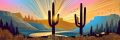 Dazzling Mesa Sunrise Over Iconic Saguaro Cacti and Serene Lake