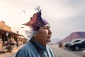 Colorfully Adorned Horse and Rider Against Mesa's Desert Backdrop